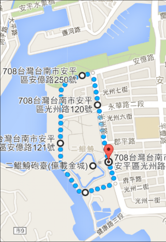 億載金城門口出發往南沿光州路繞行億載公園,途經德陽艦,可觀賞安平港無敵海港景色。繼續往前再經林默娘公園,媽祖巨型聖像會守護著你(讓你不敢偷懶^_^),遇光州路再右轉,回到億載金城門口,全程2.1公里。我們通常會跑個5圈,即使在夏天,因為緊鄰安平港附近又無大型建築物遮蔽,所以跑起來相當舒服。微微的海風吹來,讓人通體舒暢(不過冬天有時風大了點@@)