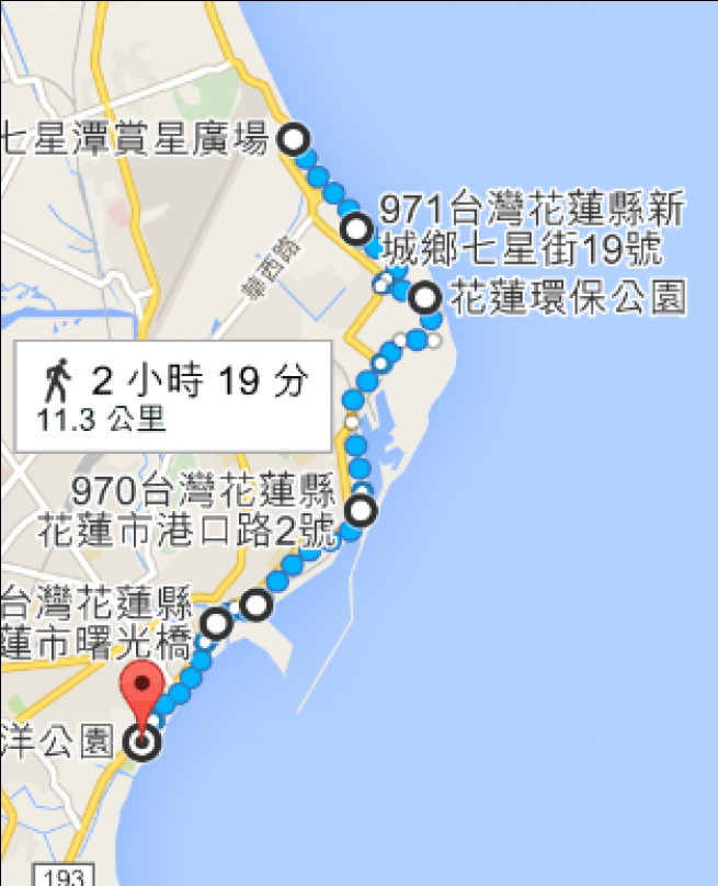 路線:七星潭賞星廣場→望海樓→四八高地→環保公園→花蓮漁港→台肥園區→花蓮港景觀橋→北濱自行車步道→曙光橋→北濱公園→南濱公園