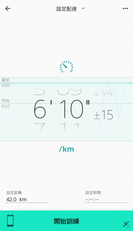 到了定點放下運動飲料,稍做暖身、轉轉關節拉拉筋,這次練跑希望配 6 分多速,所以我設定 6’10”±15”,代表從 5’55” 到 6’25” 是目標配速範圍,設定好之後,把訓練計劃傳到 Smart B-Trainer 裡,就可以準備出發!