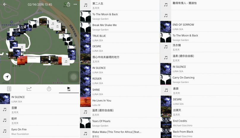 我覺得最有趣的是音樂安排的分頁,程式裡也都會把播過的歌單紀錄下來,如果資料可以抓到封面,就會看到 GPS 路線上會被貼上很多不同的專輯封面。只是我有多首重複播放的歌,看來真的需要多丟一些歌曲,才能完整豐富一場馬拉松的旅程吶!