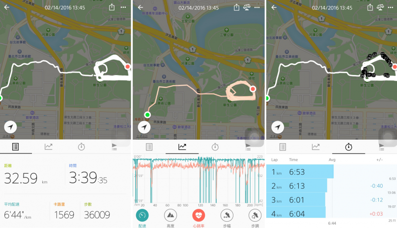 完跑後,用藍芽把跑步資料即時上傳到手機後,可以檢視跑步成果,透過 B-Trainer APP 的運動分析,針對配速、高度、心跳率、步幅、步調,是用曲線圖表表示,滑動時可以看該點當下的數據,一次可以點選兩種資訊來呈現,分頁則有每一公里的配速,介面的設計頗為簡潔乾淨。