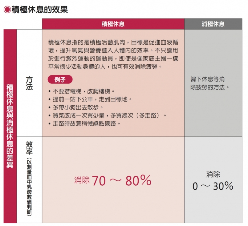 運動後疲勞的原因,是來自運動產生的疲勞物質累積在肌肉中。「積極休息」的概念是在疲勞時繼續活動身體,可促進血液循環,有效率地將氧氣和營養送入身體,排出累積的疲勞物質,儘快消除疲勞。