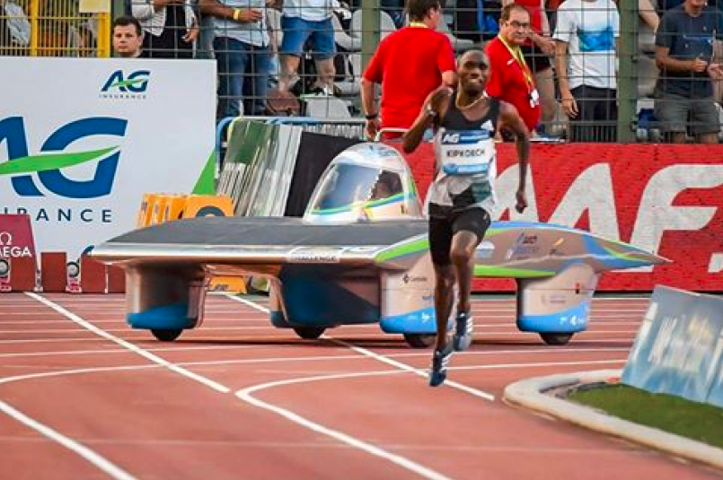 有沒有聽錯?第二名參賽者這成績還是人嗎?沒錯,它真的不是人,而是一台高效能太陽能車!這場別出心裁的人車大賽,是今年比利時 Memorial Van Damme 最後一場 IAAF 鑽石聯盟聯賽的特別賽事,雖然太陽能車的最高時速是人類代表的四倍,但是太陽能車出力小,需要較長的時間才能加速到最高速度,所以到底鹿死誰手,槍聲沒響前誰也無法預測。