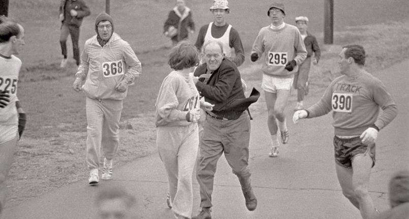 1967 年 Kathrine Switzer 成為史上第一位「正式」完成波士頓馬拉松的女性運動員。照片中的她差點被賽事主辦人推出跑道,幸而最後她的男友與跑伴共同護衛她完成比賽,成績是 4 小時 20 分。