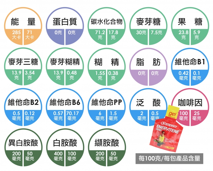 一般的能量膠必備的是 100-120 大卡的熱量,包含 20-30g 的碳水化合物,以及最基本的鈉和鉀離子,此外,往往也搭配其他微量營養素,如支鏈胺基酸(BCAA)以延緩肌肉疲勞,咖啡因以提振精神並加速代謝,維生素 C 或 B 群等。除了營養成分,市售能量膠也有因應運動員特殊需求的特製產品,如素食運動員、有機原料、低醣類(方便少量多餐)、複合醣類(如葡萄糖 + 果糖,提升利用效率)、無電解質(以搭配其他補給飲品)、小包裝(馬拉松路跑賽)、大包裝(長距離鐵人三項)等等,你可以依照比賽距離、個人偏好、或飲食習慣來選擇適合自己的產品。