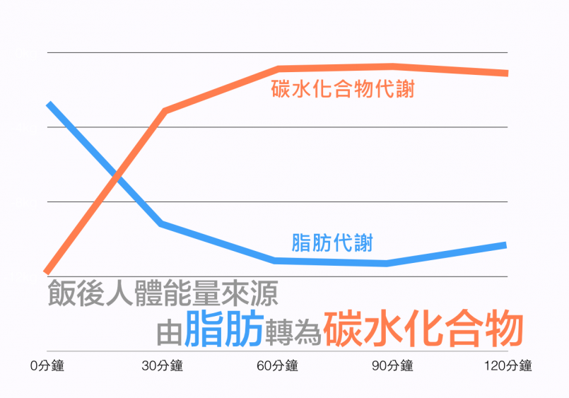 在以下的圖中,我們可以看到身體在餐後迅速的將能量來源由脂肪轉移到碳水化合物。