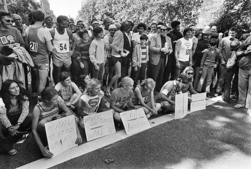 所以這年的紐約馬拉松,主辦單位只能按照規定,讓女子選手提早十分鐘出發。只是出發時間一到,槍聲一響,當年參賽的六名女子選手立刻坐下來,拿出事先做好的標語,抗議 AAU 這個莫名其妙的但書。她們整整坐了十分鐘,才站起來跟男子選手一起出發。