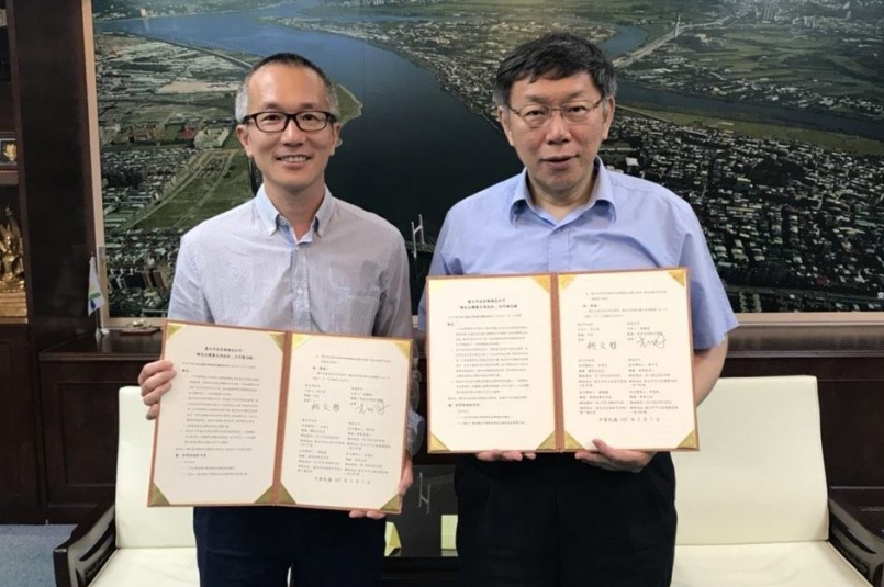 台北市長柯文哲與綠色和平東亞分部執行總監施鵬翔簽署「綠色永續台北馬拉松」合作備忘錄。 圖(圖片來源:台北市環保局)
