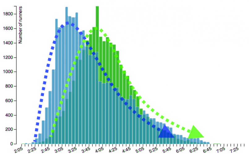 完賽時間分布圖,藍色是 2014 年波士頓馬拉松,綠色是 2014 年巴黎馬拉松。可以看到 Sub3 在巴黎馬拉松要比在波士頓馬拉松稀有得多。(圖片來源:Runner Stats blog)