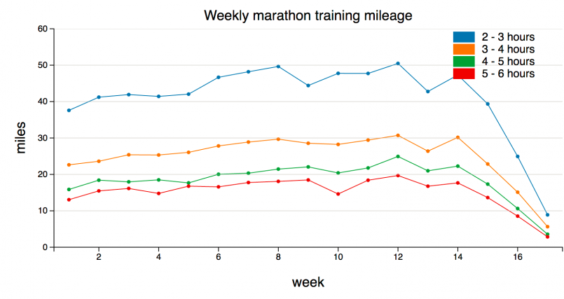 橫軸是時間,越向右邊越接近比賽。縱軸是周跑量,單位是英里(公里數 x 1.6),最上面的藍色線是 Sub3 跑者,可以看到跑量幾乎是 Sub4 跑者的 1.5~2 倍,資料來自去年參加倫敦馬拉松的七千多位跑者,使用 Strava 的訓練紀錄。(圖片來源:Scott Logic)