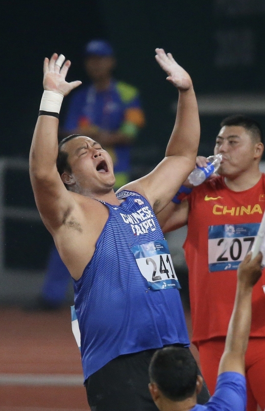 中華隊鉛球好手張銘煌在雅加達亞運擲出個人賽季最佳的 18 公尺 98,高興歡呼。(圖片來源:特派記者陳正興/雅加達攝影)