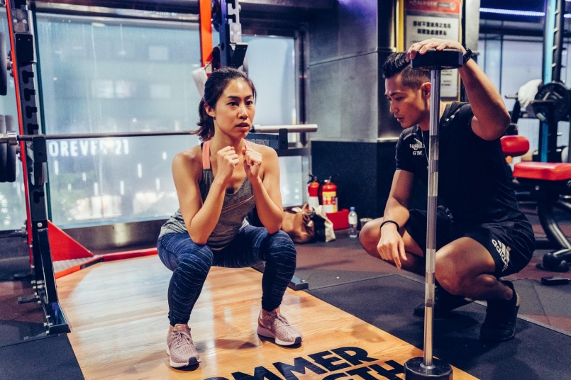 進行負重前,教練首先檢視我徒手深蹲姿勢是否正確:重心落在腳掌中央、背挺直不可圓背、頭部與脊椎呈一直線。動作標準後再循序漸進地增加重量。