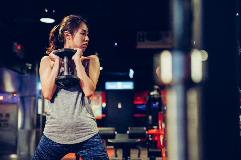 - 臀部後推,身體往下做深蹲姿勢,背部保持挺直繃緊,下巴往前,啞鈴緊貼胸部。雙腳保持不動,雙膝在下蹲和站起時向外側打開。