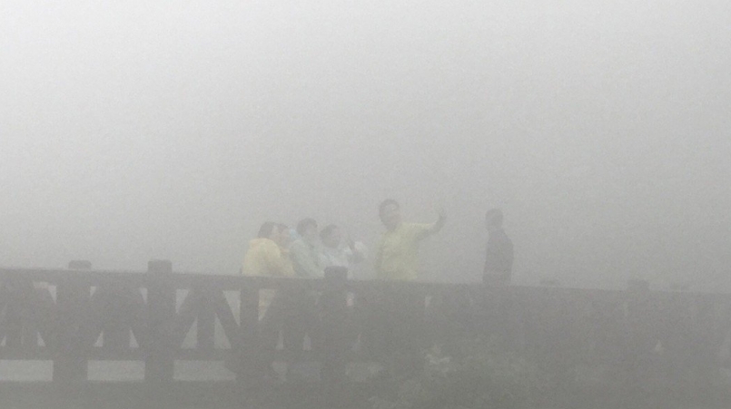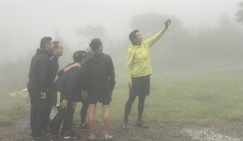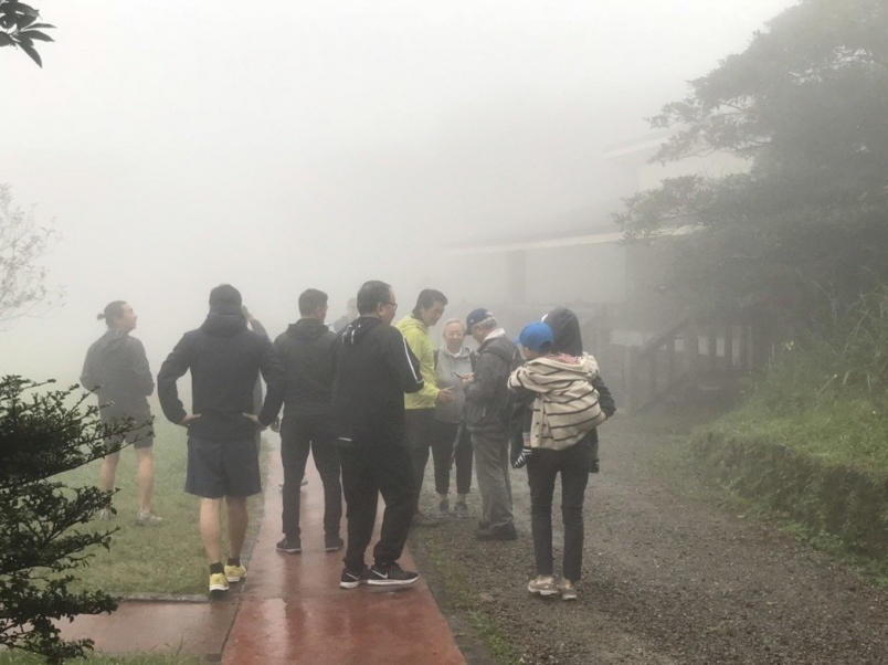 發哥繞湖一圈後,停在橋上和一群朝他尖叫的阿姨拍照,發哥也親切說:「妳衣服顏色跟我ㄧ樣耶。」在濃濃大霧中他們拍得相當開心,隨即一行人折返跑,恰巧遇上剛剛沿路想拍照卻又追不上的民眾,其中一對父母背著孩子,發哥親切關照,讓小朋友站在石頭平台上方便合影,也詢問:「怎麼不讓小朋友自己走。」對方應答:「忘記幫孩子帶鞋子了。」